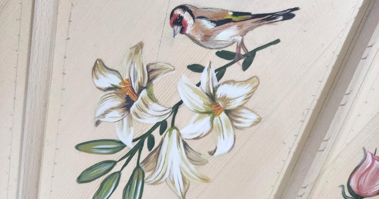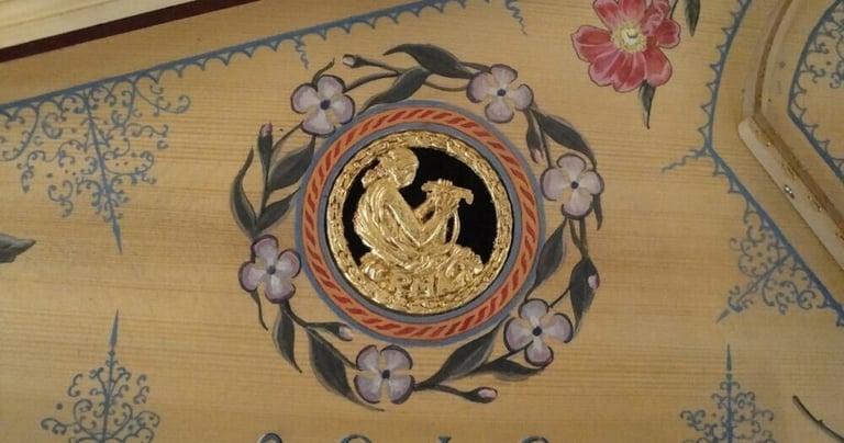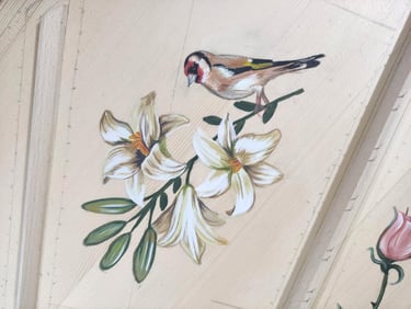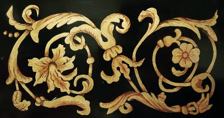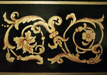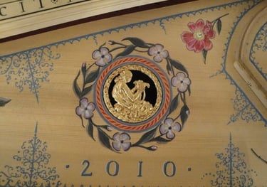 He realizado decoraciones de tabla, así como decoración exterior en tapa y caja del instrumento, todo ello a mano alzada con pinturas de calidad. En cuanto a la decoración de la caja, la he realizado en estilo flamenco y francés, con las particularidades históricas que diferencian ambas decoraciones.